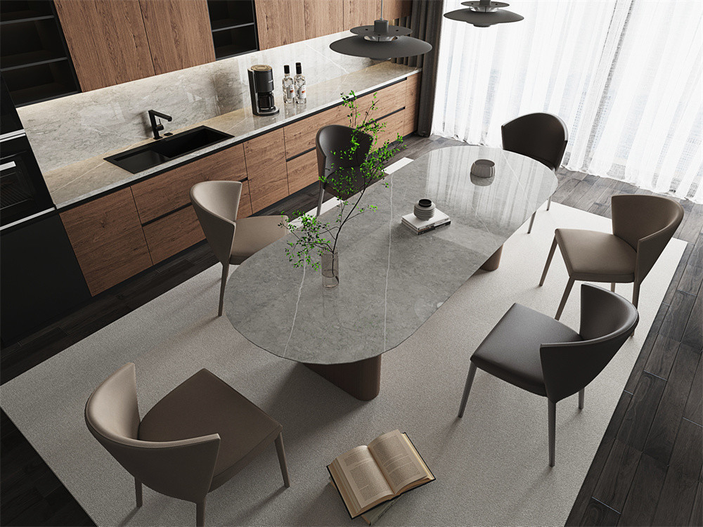 Mengubah kantor Anda dengan daya tarik elegan dari putih abu-abu dipoles sinter batu slab sebagai permukaan meja Anda.estetika minimalis.Papan batu sinter yang dipoles memberikan permukaan reflektif yang dengan lembut menerangi ruangan, menciptakan lingkungan yang mengundang untuk bekerja atau belajar.Karakteristiknya yang tahan lama dan mudah dibersihkan memastikan bahwa meja Anda tetap murni dan fungsional dari waktu ke waktu, mempromosikan efisiensi dan gaya.